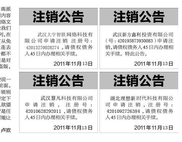 5、申请登报日期:这个需要企业跟报社事先讲清楚,注销公司的公告哪年哪月哪日必须跟你见报,一般这个日期是跟你去工商部门办理注销时间密切相关的。大家需要注意的是,如果公告时间不足是不可以去办理注销手续的。